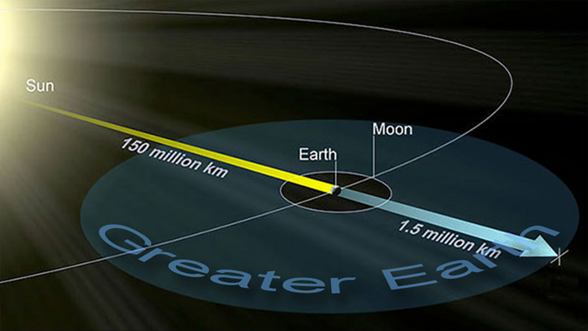⊕ is the Greek astronomical symbol for planet Earth and is the symbolic form of the GE⊕ Lunar Power Station – a circle divided by a central cross. Greater Earth - GE⊕ - is a new perception of our planet that is based on Earth's true cosmic dimensions as defined by the laws of physics and celestial mechanics. Earth's gravitational influence extends 1.5 million kilometers in all directions from its center where it meets the gravitational influence of the Sun. This sphere, with a diameter of 3 million kilometers, has 13 million times the volume of the physical Earth and through it, passes some more than 55,000 times the amount of solar energy which is available on the surface of the planet. In addition to energy, within this sphere are other resources, including the Moon and occasional passing asteroids. Greater Earth is also understood to be an interdependent dynamic system involving the cosmic interactions of the Sun, the Moon and the Earth that has enabled life on Earth to emerge, to survive and to thrive. Awareness of Greater Earth and extending civilization throughout its regions may help catalyze an optimistic path to a sustainable and prosperous future for all humanity on Earth and beyond.