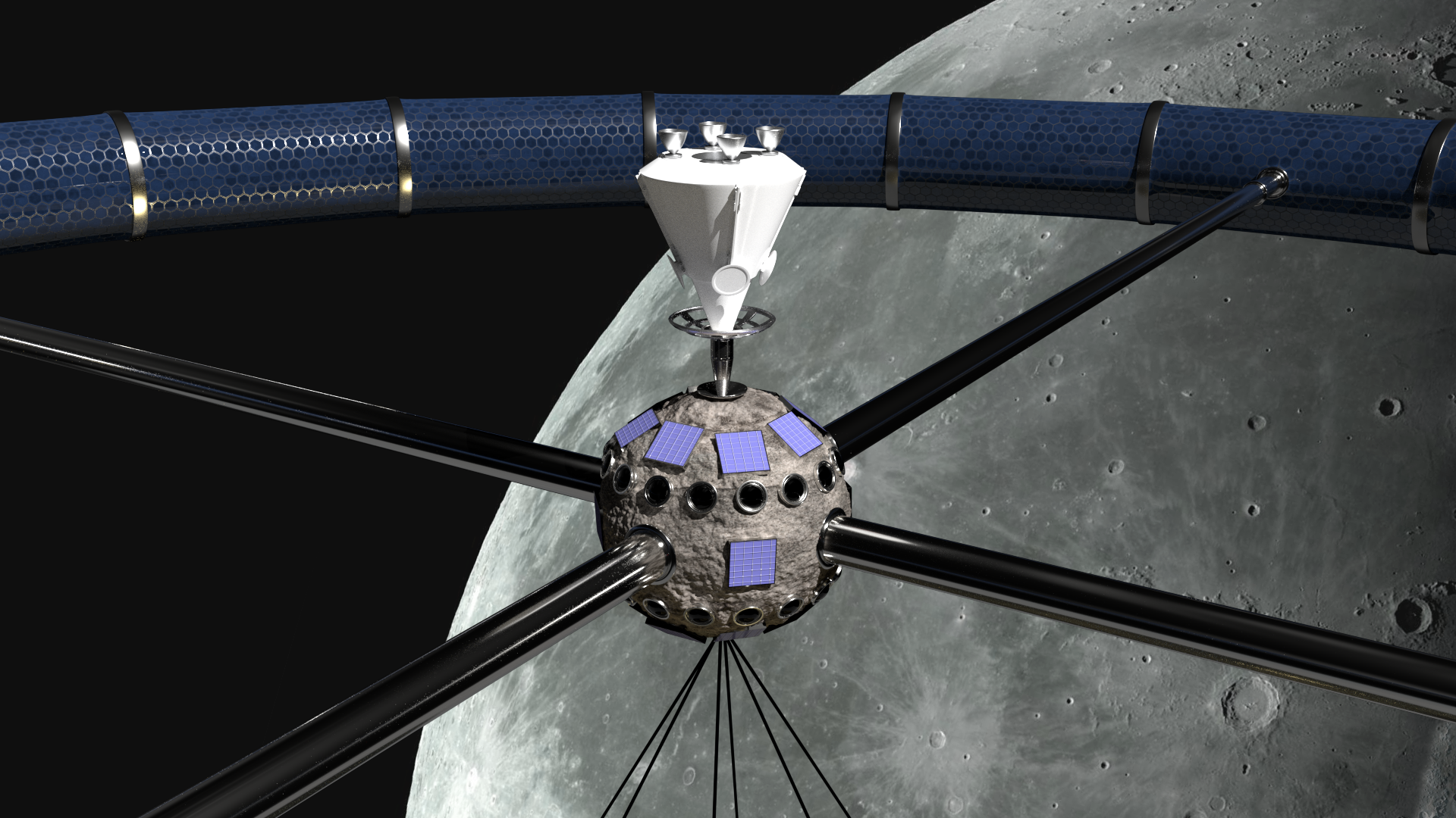 Likewise, the central habitation module of the GE⊕-LPS would also be constructed in a modular manner and sent into orbit for assembly. First, using industrial 3D additive manufacturing techniques, a lightweight geometrical spherical structure – either an icosahedron or a geodesic polyhedron - would be built and sent into orbit. The outer surface of the habitat would be covered with matching interlocking elements made from “lunarcrete” produced in a lunar factory designed for this purpose [14]. Lunarcrete would be manufactured by beneficiating lunar rock that has a high calcium content. Water would either be supplied from sources on the Moon, or by combining oxygen with hydrogen produced from lunar soil [15]. When completed the outer surface of the habitat would consist of layers of “lunarcrete” modules which, together with an interior water barrier, also extracted from the Moon, would provide the necessary radiation shielding for the habitat. Once the initial structure was completed and sealed, interior components would be integrated. The habitat module would become the central basis of the GE⊕-LPS. Additive manufacturing methods would also apply to the construction of the four main spokes of the station. Making lunar glass by melting regolith can produce building materials of extreme strength and durability; anhydrous glass made from lunar soil would be stronger than alloy steel, with a fraction of its mass. Asteroid capture may be required to supply additional materials and minerals not found on the Moon [16].