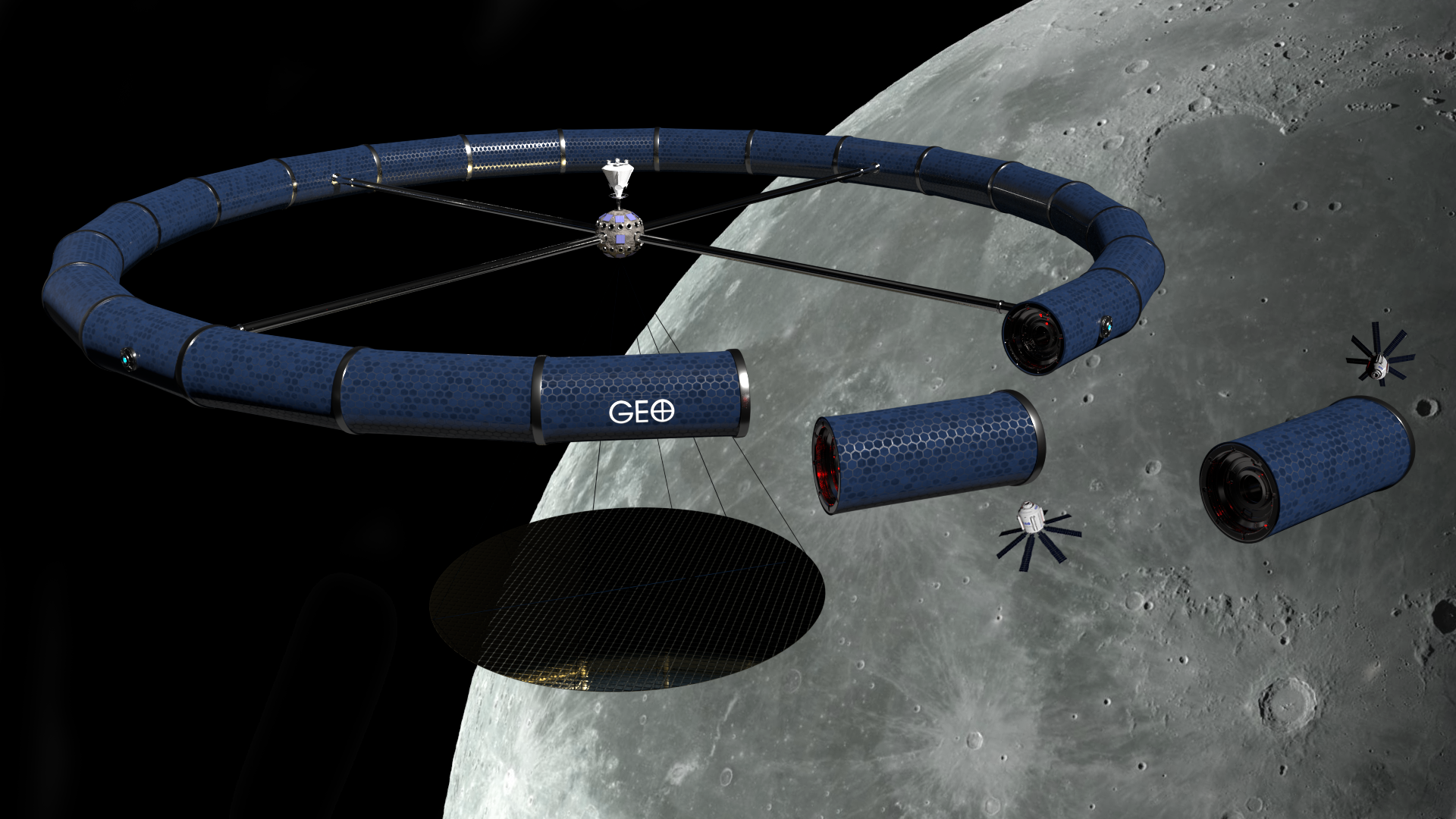 The finished PV elements would be sent into lunar orbit via an electromagnetic linear accelerator or a “Mass Driver” where they will be assembled into the toroidal elements of the GE⊕-LPS. The lunar mass driver concept was proposed in 1970s by American physicist Gerard O’Neill and his colleagues as a means of launching material from the lunar surface with the goal to build large orbital space colonies. A lunar mass driver several kilometers long should be able to deliver 600,000 tons a year to L-5, or more easily to L-2, at a reasonable cost. NASA has indicated the Moon’s L1 and L2 libration points would be the ideal location to receive to assemble large space structures [13]. The basic technology for mass producing manufacturing photovoltaics already exists and the engineering aspects of doing this on the Moon are typical of major construction and manufacturing techniques used on Earth. Thanks to Apollo, there exists substantial information about the lunar environment. Mass driver technology also has been researched and tested.
